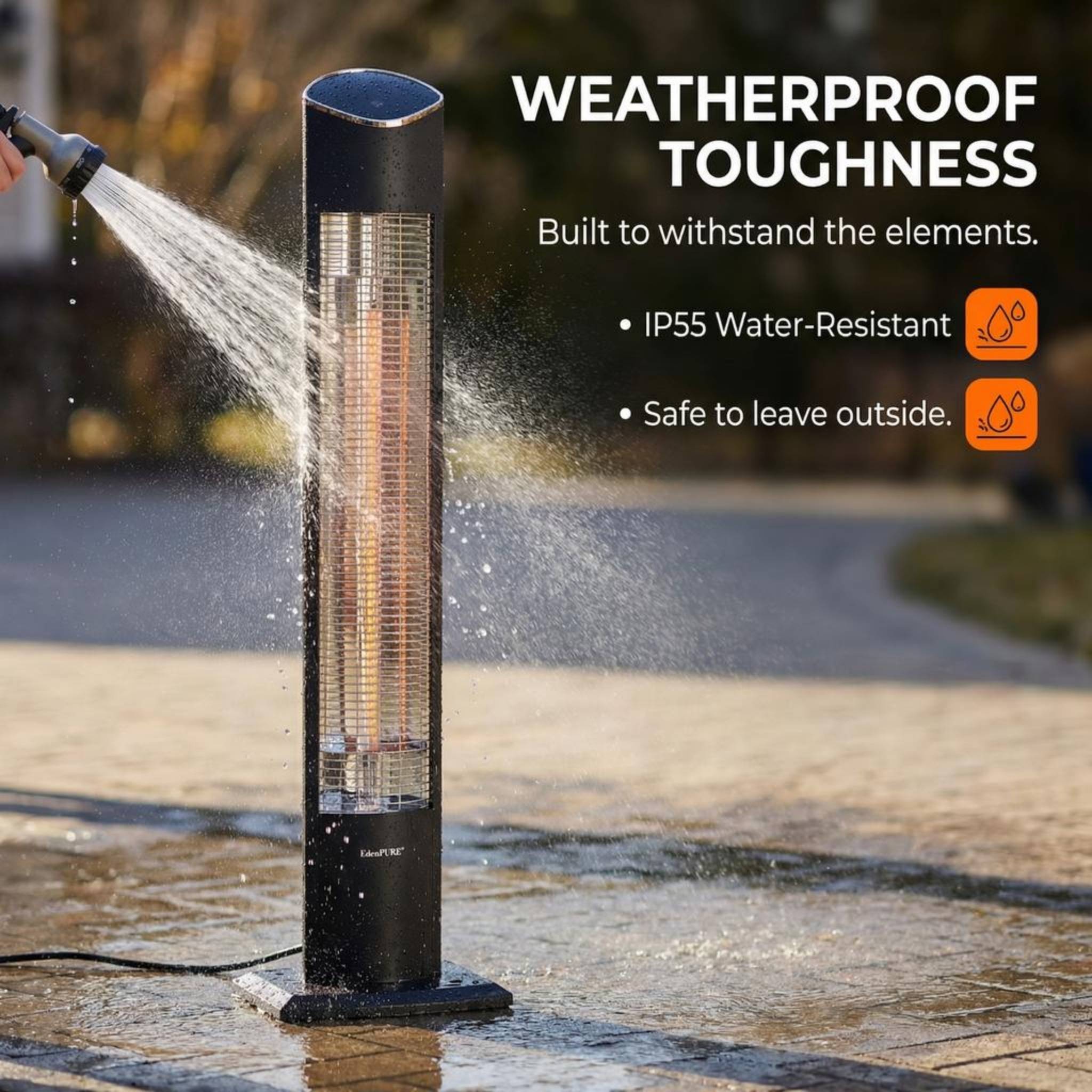 The EdenPURE All Season Heater® is IP55 Weatherproof and water-resistant so you have peace of mind that your heater is protected from the rain, water, dust, and snow.
